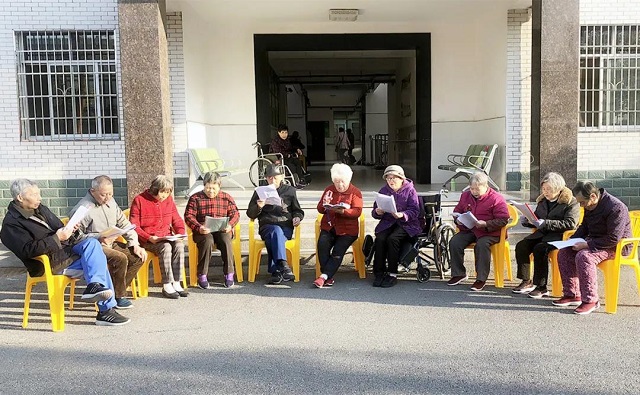 在株洲渌口区海福祥养老护理院,活跃着这样一支歌咏队,他们由11位平均年龄在70岁以上的老人组成,他们以歌会友,一起歌唱美好。这不,趁着大好春光,爷爷奶奶们一大清早就搬出了椅子围坐在一起练习唱歌,每次他们排练的时候,都会是院子里最靓丽的一道风景线。